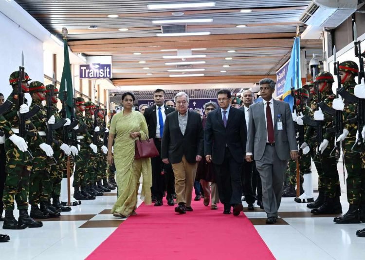 দীর্ঘ সাত বছর পর অ্যান্তোনিও গুতেরেস গত বৃহস্পতিবার (১৩ মার্চ) বিকেলে দ্বিতীয়বারের মতো বাংলাদেশ সফরে আসেন। হযরত শাহজালাল আন্তর্জাতিক বিমানবন্দরে তাকে স্বাগত জানান অন্তর্বর্তী সরকারের পররাষ্ট্র উপদেষ্টা তৌহিদ হোসেন।