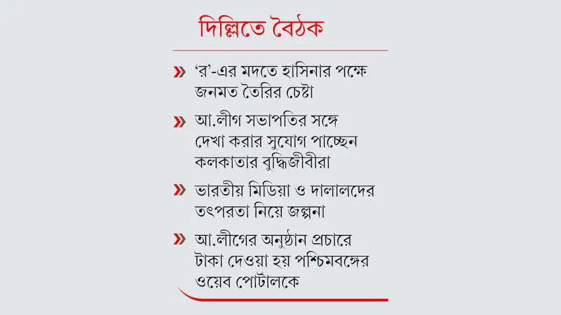 শুধু সম্মেলন নয়, ডিজিটাল প্ল্যাটফর্মেও চলছে হাসিনার পক্ষে প্রচারণা। অভিযোগ রয়েছে, পশ্চিমবঙ্গের একটি ওয়েব পোর্টাল নিয়মিত আওয়ামীপন্থি অনুষ্ঠান প্রচার করছে। এর পরিচালক ধবল সরকার (ছদ্মনাম) নাকি আওয়ামী লীগের কাছ থেকে কয়েক কোটি টাকা নিয়েছেন। পাশাপাশি অসংখ্য ফেসবুক ইনফ্লুয়েন্সারকে অর্থ দিয়ে নানা বিষয়ে প্রচারণা চালানো হচ্ছে।