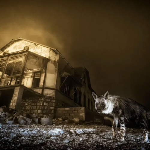 আলোকচিত্রী হিভারের ছবিটিতে দেখা যায়—একটি বিরল প্রজাতির বাদামী হায়েনা এক পরিত্যক্ত ভবনের সামনে দাঁড়িয়ে ক্যামেরার দিকে স্থির দৃষ্টিতে তাকিয়ে আছে। রাতের আলো-আধারিতে ভাঙাচোরা ভবনের পেছনে দাঁড়ানো সেই হায়েনার চাহনি যেন এক নিঃশব্দ প্রতিচ্ছবি—মানব সভ্যতার ক্ষয়িষ্ণুতার মাঝে বন্য প্রকৃতির বিজয়ের প্রতীক।