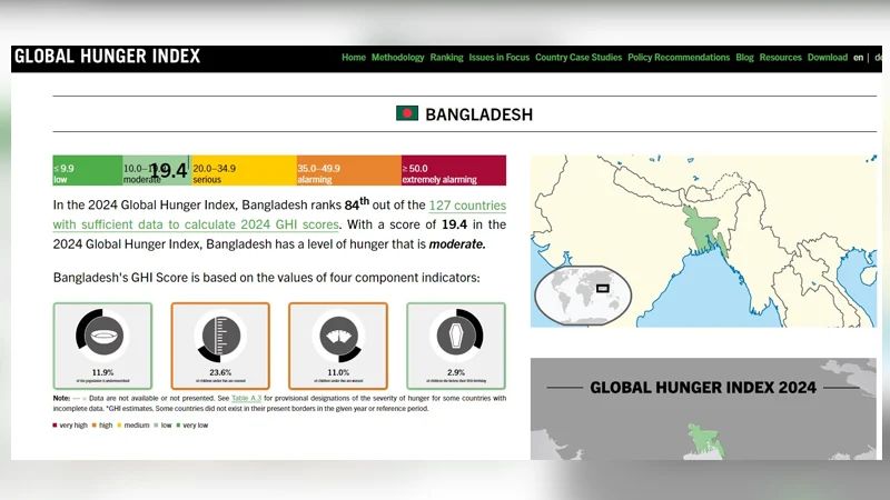 বিশ্ব ক্ষুধা সূচক (Global Hunger Index) ২০২৪ অনুযায়ী, বাংলাদেশের অবস্থান গত বছরের তুলনায় অবনতি হয়েছে। গত বছর বাংলাদেশ ছিল ৮১তম স্থানে, স্কোর ছিল ১৯। এ বছর ১২৭টি দেশের মধ্যে বাংলাদেশ রয়েছে ৮৪তম স্থানে, স্কোর বেড়ে হয়েছে ১৯.৪। যদিও ক্ষুধার স্তর মধ্যম পর্যায়ে রয়েছে, তবে গত কয়েক বছরে বাংলাদেশের স্কোরের কিছুটা উন্নতি হয়েছে। ২০১৬ সালে স্কোর ছিল ২৪.৭, যা এ বছর কমে এসেছে।