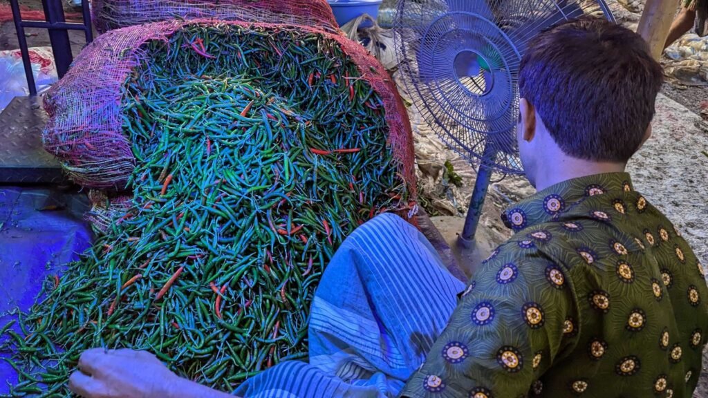 গত সপ্তাহে বাড়তির দিকে থাকা কাঁচা মরিচের দামও কমতে শুরু করেছে। খুচরা পর্যায়ে প্রতি কেজি কাঁচা মরিচ বিক্রি হচ্ছে ২০০-২২০ টাকায়, আর পাইকারিতে ১৫০-১৬০ টাকা। কারওয়ান বাজারের ব্যবসায়ীরা জানালেন, সরবরাহ বৃদ্ধির ফলে মরিচের দাম কমেছে, এবং ঝড় বা বৃষ্টি না হলে আরও দাম কমার সম্ভাবনা রয়েছে।