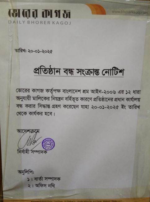 নোটিশে উল্লেখ করা হয়, বাংলাদেশ শ্রম আইন-২০০৬ এর ১২ ধারা অনুযায়ী, মালিকের নিয়ন্ত্রণের বাইরে থাকা পরিস্থিতির কারণে প্রতিষ্ঠানটির প্রধান কার্যালয় বন্ধ রাখার সিদ্ধান্ত নিতে বাধ্য হয়েছে কর্তৃপক্ষ। ২০ জানুয়ারি থেকেই এই সিদ্ধান্ত কার্যকর হবে। পত্রিকার প্রধান কার্যালয় বন্ধ থাকা মানেই এর প্রকাশনা কার্যক্রমও বন্ধ হয়ে যাবে বলে সংশ্লিষ্টরা নিশ্চিত করেছেন।